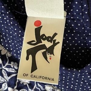 Vintage Jody T of California Smocked Dress. Size 5. White and blue print. Gunne Sax style gorgeous prairie dress. Smocked front. Ruffle trim around neckline. Tie at the waist. Elastic near the ends of the sleeves. Excellent condition! Measurements are in the pictures.