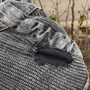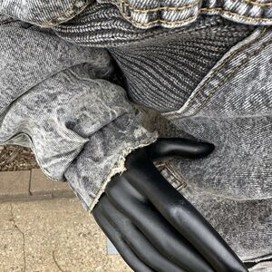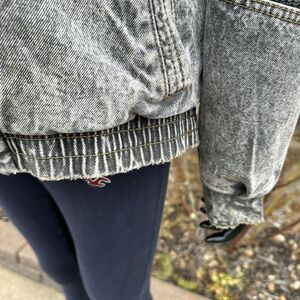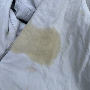 There is a rip on the sleeve of the jacket. There is fraying on the sleeve around the hem of the sleeve and bottom. And there is spots on the inside lining of the jacket. There is no size tag. Please use measurements to ensure a good fit.