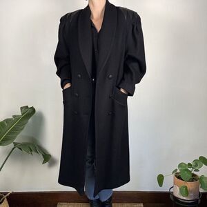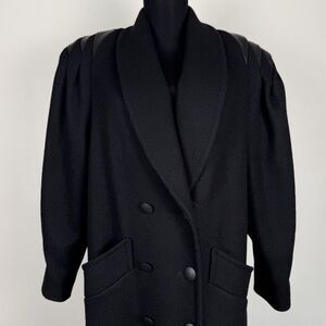 This coat is amazing!! She features a dramatic 1980s silhouette with structured shoulders trimmed in genuine leather, a shawl collar, a double-breasted front and finished with smooth matte buttons. A timeless, high-quality vintage piece with strong design details and craftsmanship typical of the era!