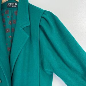 Details: Made in USA by IL Garment Workers Union. Vintage Jofeld wool full-length coat. Long overcoat length. Gorgeous jewel-toned emerald green color. Fully lined with shoulder pads, brass buttons, double breasted, balloon shoulder, and 2 front pockets. Perfect for the holidays!