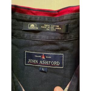 This Vintage John Ashford Button Down Men's Large Striped Shirt from the 90s is a stylish piece made of cotton fabric with a canvas texture. The shirt features a collared neckline, button-front closure, and long sleeves, perfect for a casual occasion. With a retro 90s theme and a multi-color striped pattern, this shirt is a great addition to any man's wardrobe, suitable for all seasons. Made in Sri Lanka by John Ashford, this button-up shirt offers a regular fit and is machine washable for easy care.