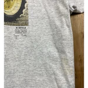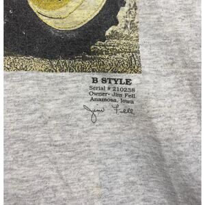 Vintage John Deere tractor t-shirt featuring a classic B Style tractor graphic with barn background. Artwork includes serial number, owner’s name (Jim Fell, Anamosa, Iowa), and Dynamic Embroidery from Marion, Iowa. Printed on a Gildan Heavyweight tag, Made in USA. Hard-to-find piece of vintage farm and tractor history.