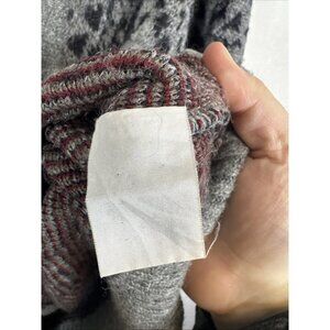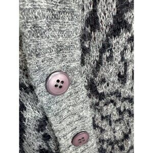 Vintage John Edward wool cardigan made in Spain. Soft fuzzy texture with grey, black, and subtle red geometric pattern. Button front, ribbed cuffs and hem, relaxed drape. No major flaws noted.