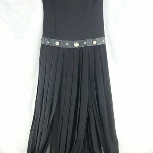 This piece has a lot of really beautiful design going on in it. Women’s size small, sleeveless top with leather band and metal hardware around bust, from the waist down is a sheer design with multiple splits leaving four pieces altogether which move freely as you walk