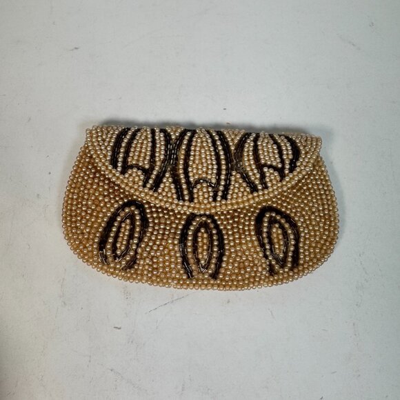Vintage John Wind Beaded Evening Small Clutch Beige & Brown Pattern Faux Pearls
