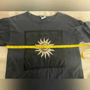 90s T-shirt dress, top half is cotton with silk square trimmed & an embroidered sun. Bottom half is silk.