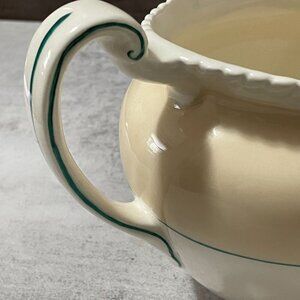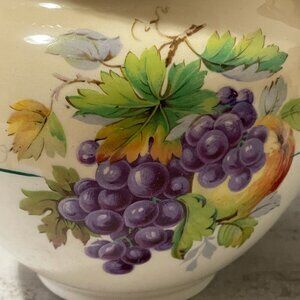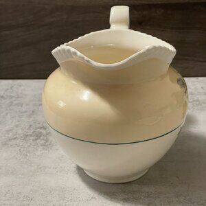 "California" was one of Johnson Brother's most popular early pattern with it's motif of lush fruits surrounded by a rope border. Back stamp dates this from 1921 to 1940. It came in several colorways including this which is typically called "beige". While the plates are more easily found, the serving pieces are rare. We are pleased to offer this 5 cup/40 ounces beautiful pitcher which measures 7" from spout to edge of handle X 6" from base to highest. We have coordinating pieces in our store including a rare oblong platter.