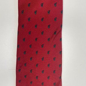 Vintage Jonathan Woods men's tie in crimson red. Details in black, white, and green. Between 57" - 60" in length. Good condition. Worn moderately. 100% silk.