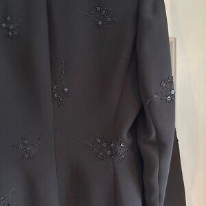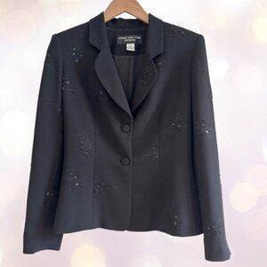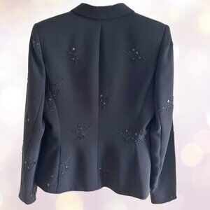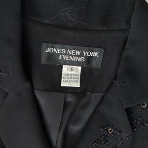 This vintage Jones New York blazer is late 90s or early Y2K (can't recall exactly when I bought it!) and still overall in very good condition. It is fully lined with the lining in excellent shape (see photo), and all beading appears to be intact. There is one small thread pull on the back of the right arm (see photo) that can probably just be trimmed. The jacket is single breasted with two covered button closure, with lightly padded shoulders and a fitted silhouette.
