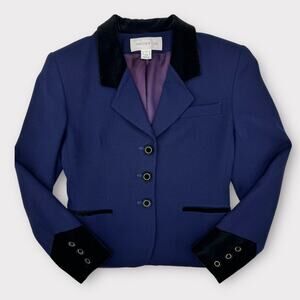 This vintage Jones New York blazer is a refined, structured piece made in the USA from 100% worsted wool in a rich indigo navy (navy with slight purple undertone) with black velvet accents throughout (collar, cuffs, buttons, and back faux belt). It features lightly padded shoulders, welt pockets (still sewn closed), and striking covered buttons accented with a velvet and gold-tone ring detail. Fully lined in purple satin for a luxurious finish, this blazer blends timeless tailoring with elegant design — perfect for workwear, evening dressing, or collectors of fine vintage pieces.