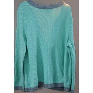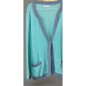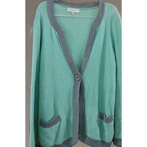 Vintage Jones New York Sport womens 2XL knit cardigan in a soft green with gray trim and front pockets classic preppy / coastal grandma / Y2K knitwear aesthetic. 100% cotton with slight stretch and oversized cozy fit.