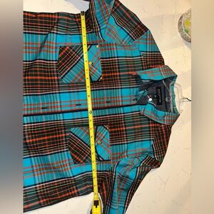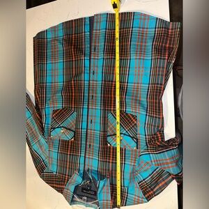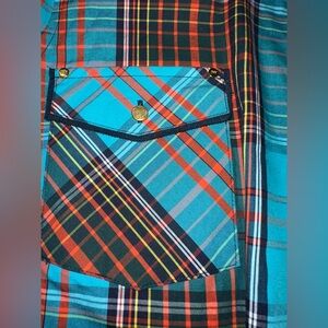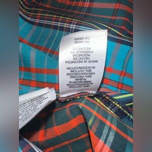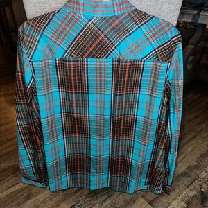 Stylish plaid shirt by Jones New York. Features a blend of blue, red, and green tones.