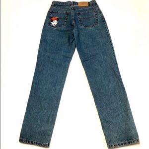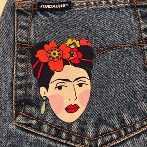 Adorable high-rise mom jeans with Frida Kahlo decal on left back pocket. Zip fly and button closure. Very good pre-loved condition. Size/Care tag removed. I am estimating size 28, but please see photos for approximate flat lay measurements to ensure proper fit. :)