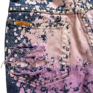 Vintage size 5/6, Acid washed purple ombre denim with all over distressing. High waist, Wide leg, Raw hems, Zip and button closure, Five pocket styling, Belt loops, Cotton/spandex.