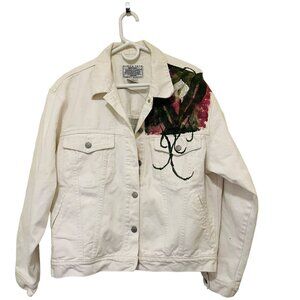 Vintage Jordache Jean Jacket Coat Hand Painted Floral Design White Size Large