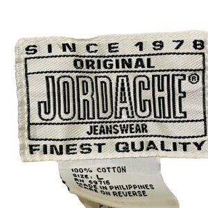 This unique vintage Jordache jean jacket features a stunning hand-painted floral design on a white canvas. Crafted from 100% cotton for a comfortable fit.