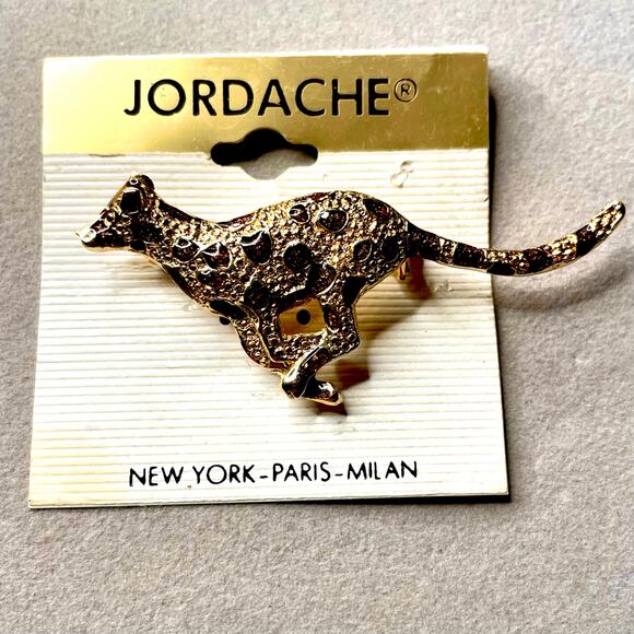 Vintage Jordache Running Leopard Gold Tone Brown Enamel Brooch