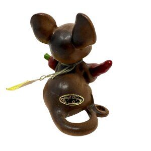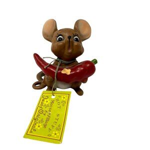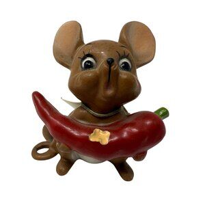 Adorable vintage Josef Originals Mouse Village figurine titled “Hot Stuff.” This whimsical ceramic mouse is holding a bright red chili pepper and comes with its original hang tag still attached. With big expressive eyes and charming hand-painted details, this figurine is part of the highly collectible Josef Originals Mouse Village line.