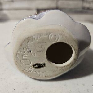 This vintage Josef Originals Tina from the First Love series, despite being chipped, adds a touch of retro charm to any decor. Made of porcelain. it features a purple and white color scheme.