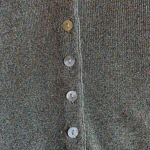 Classic vintage cardigan made of silk and lurex, kind of a grey-green color but with multicolor shine. Real shell buttons too!