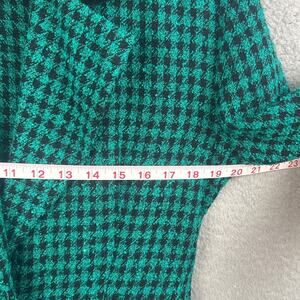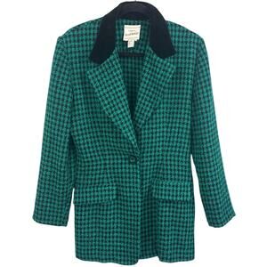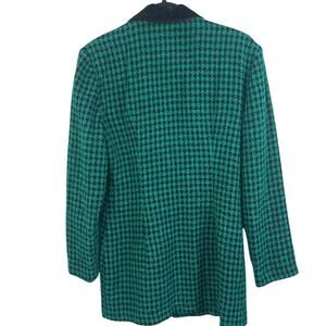 Vintage Joseph Ribkoff Bouclé Blazer – Fitted hip-length style in a striking green and black check pattern. Features a textured bouclé fabric for a timeless, polished look. Size 10.