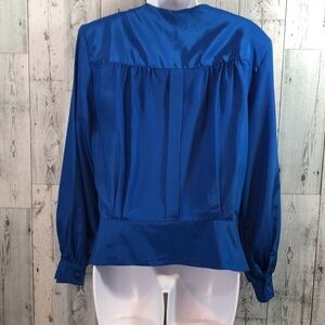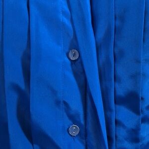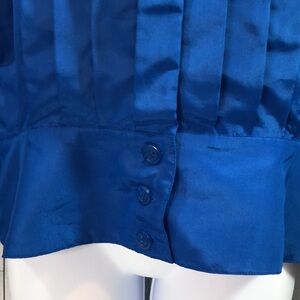 Royal blue, pleated front with hidden buttons, wide waistband with buttons, shoulder pads, button cuff, small white spot lower right front see picture,colors may vary due to lighting, good condition, size: 12