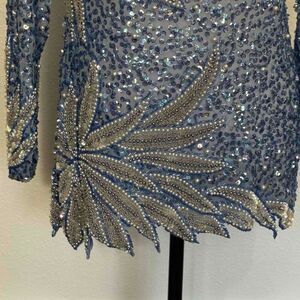 Vintage Jovani Mini Dress Tunic Long Sleeve Beaded Sequin Blue Silver Size Small