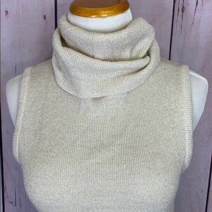 Sweater with loose turtleneck and no sleeves. Light ivory color with gold glitter infused throughout. Tags says large, but like vintage clothes it fits more like a small. Measurements are taken laying flat and are approximate. Bust 15”, length 23”. No rips, stains or tears.