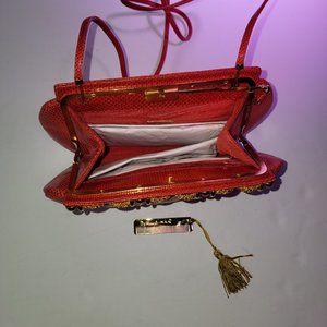 Vintage Judith Leiber Red Snakeskin Clutch with Strap and Gemstones w/ gold comb