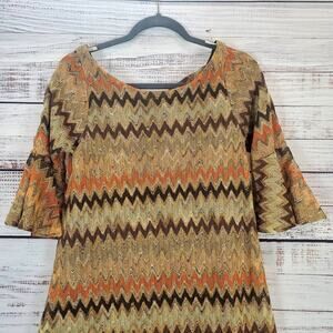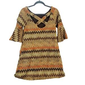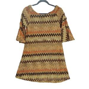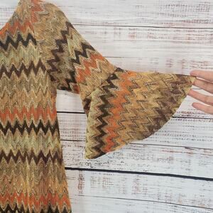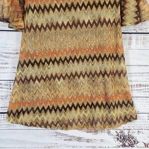 Vintage Judith March Shift Dress M Earthy Crochet Lace Chevron Bell Sleeve