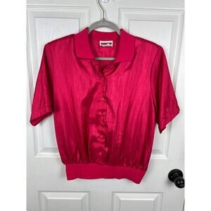 Vintage Judy Bond Pink Red Nylon Sweaterwaist Top Short Sleeve Button Front 10