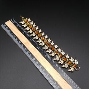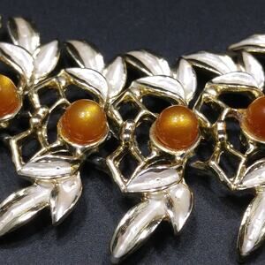 This is a gorgeous Judy Lee floral link bracelet from the 1960s, featuring white enamel leaves over gold-tone metal with rust-colored glitter Lucite cabochons that shimmer with tiny flecks of gold. The wide link design creates a bold mid-century statement while still being feminine and elegant.