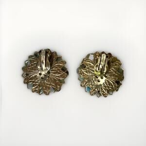 These Vintage Judy Lee Earrings are a stunning pair of clip-on earrings from the 1960s, featuring a beautiful blue and gold tone design with beaded accents. The earrings are signed by the brand Judy Lee. They are perfect for various occasions such as engagements, weddings, birthdays, and more. The earrings are a large statement piece with beautiful shades of blues making them a unique and eye-catching addition to any jewelry collection.