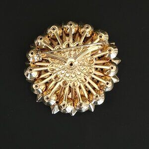 This gorgeous signed Judy Lee brooch is an explosion of purple and fuchsia rhinestones in alternating rows all prong set into shiny gold tone metal.