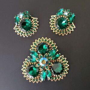 Beautiful brooch and earring set from Judy Lee features rich, emerald green glass rhinestones in various shapes and sizes and one AB accent stone, all prong set, or in the case of the large round stones, multi-prong set into shiny gold tone metal. Clip back earrings to match--fabulous design!