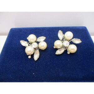 Vintage Judy Lee silvertone clip on earrings featuring large faux pearls and rhinestones. Some light tarnishing and peeling of the foil behind the rhinestones as can be seen in pictures. 1.75"x1.75"