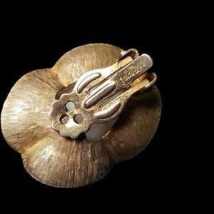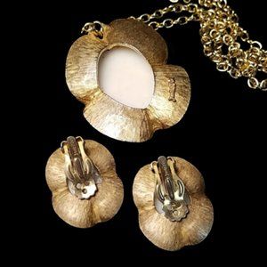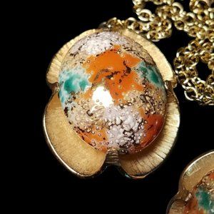 Vintage signed Judy Lee "Easter Egg " glass necklace and earring set. Beautiful scalloped brushed gold tone setting. Pendant measures 2 1/8 by 1 5/8" with 24" chain. Clip earrings measure 1 1/4 by 1". All pieces signed.