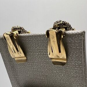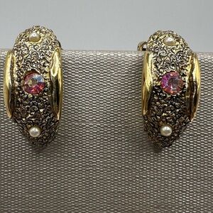 Vintage Judy Lee Textured Gold Tone Pink AB Crystal Faux Pearl Clip On Earrings