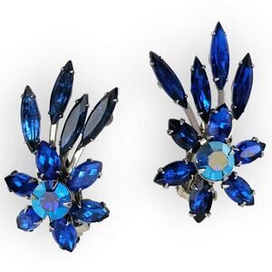 Vintage 1950s Judy Lee sapphire blue glass clip on earrings with a center Aurora Borealis stones are a stunning spray for a special touch of elegance.