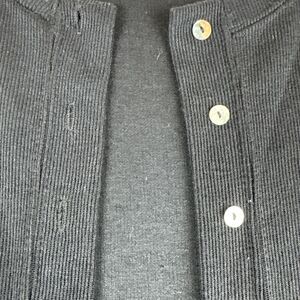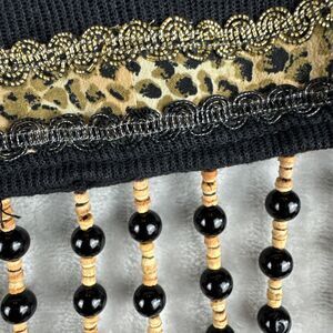 ~ Solid black cardigan with ribbed texture and black buttons. Crew neck, long sleeves. Hem is trimmed with cheetah print ribbon, and swirls of tiny black and gold beads. Larger wooden and black beads are used for a fringe detail.