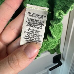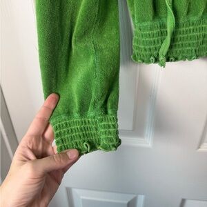 Features a deep v neck line with ties that can either be tied or left as is, elastic ruching on the hem and sleeves for a bubble fit, terry fabric, green.