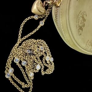 Vintage Y2K Juicy Couture bag FEATURES a compact round canteen silhouette. Signature logo embossed all over two highland terriers holding a shield bearing three hearts and Love P&G. Rhinestone studded gold tone chain. Heart shaped zipper pull charm. Lined.