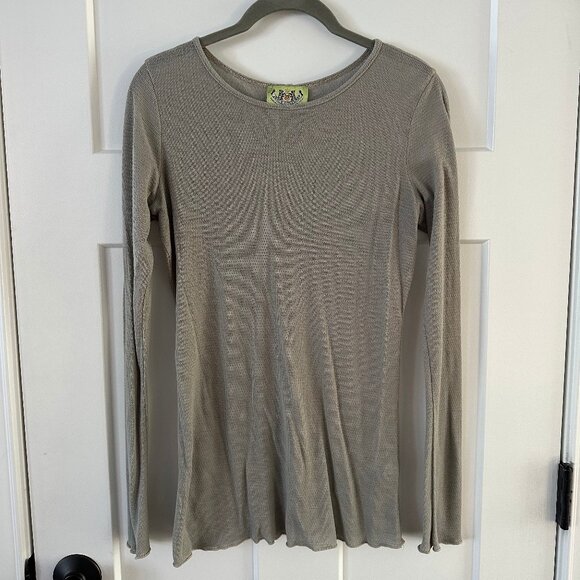Vintage Juicy Couture long sleeve top in a neutral grey/taupe tone. Soft, lightweight thermal waffle-knit with stretch, scoop neckline, raw lettuce hem, and exposed center back seam. Made in the USA from a rayon/poly blend. A classic early-2000s Juicy layering essential.
