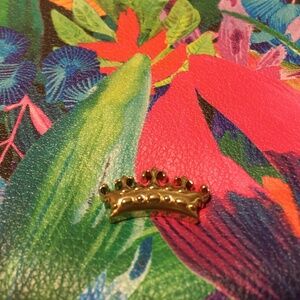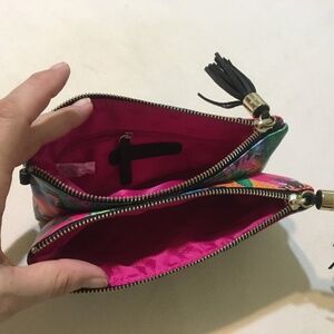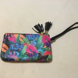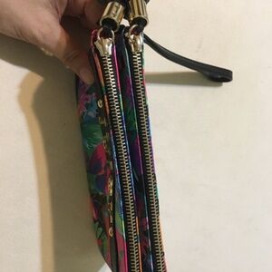 Floral print wristlet with black trimming and zipper tassels. 2 zip compartments for credit cards/ID slots and other accessories.