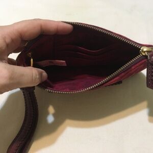 Vintage wristlet that has worn corners that now shows grey trimming.
