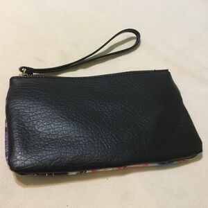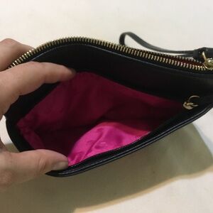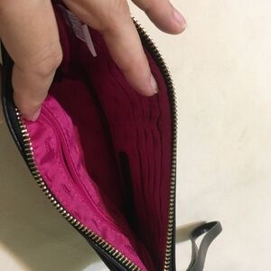 Exterior zip compartment and the interior has another zip compartment and credit cards/ID slots.