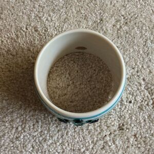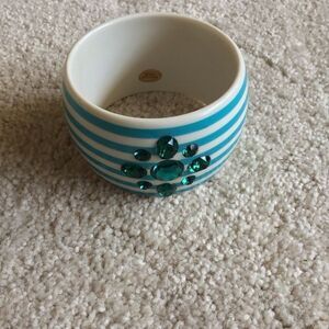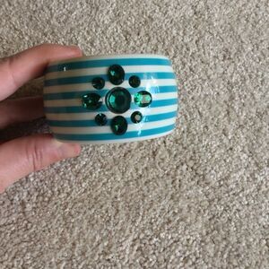 Stylish bangle with teal stripes and green gemstones. Perfect for adding a pop of color.