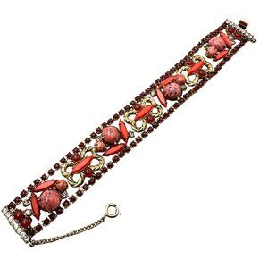 This exquisite Vintage Juliana bracelet features coral glass rhinestones set in a rare twisted gold rope design. A timeless piece for any jewelry collection, it captures the essence of elegance and sophistication.