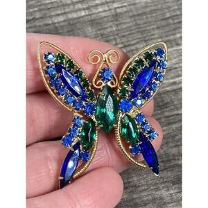 Vintage Juliana D & E Blue & Green Rhinestones Gold Tone Butterfly Brooch Pin. This is in excellent preowned condition. The pin closure works perfectly. It measures 1 - 5/8” x 1 - 5/8”. Very beautiful piece. Please message me prior to purchase with any questions. Thank you!