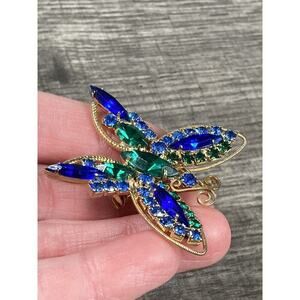 Vintage Juliana D & E Blue & Green Rhinestones Gold Tone Butterfly Brooch Pin
